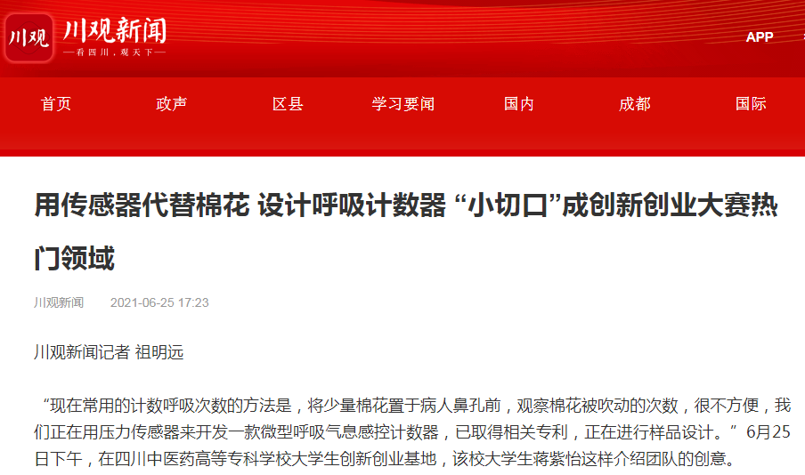 川观新闻:用传感器代替棉花 设计呼吸计数器 “小切口”成创新创业大赛热门领域