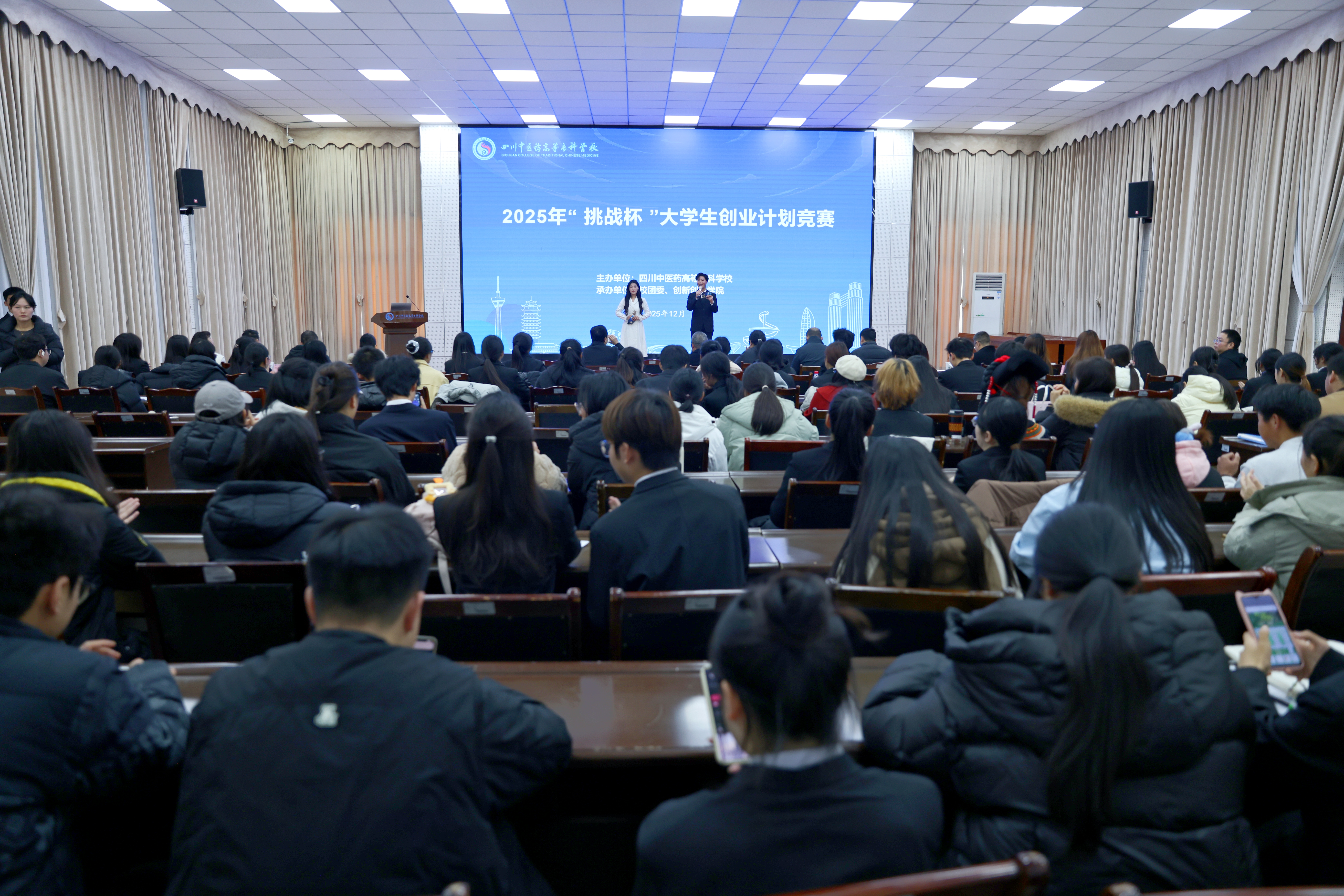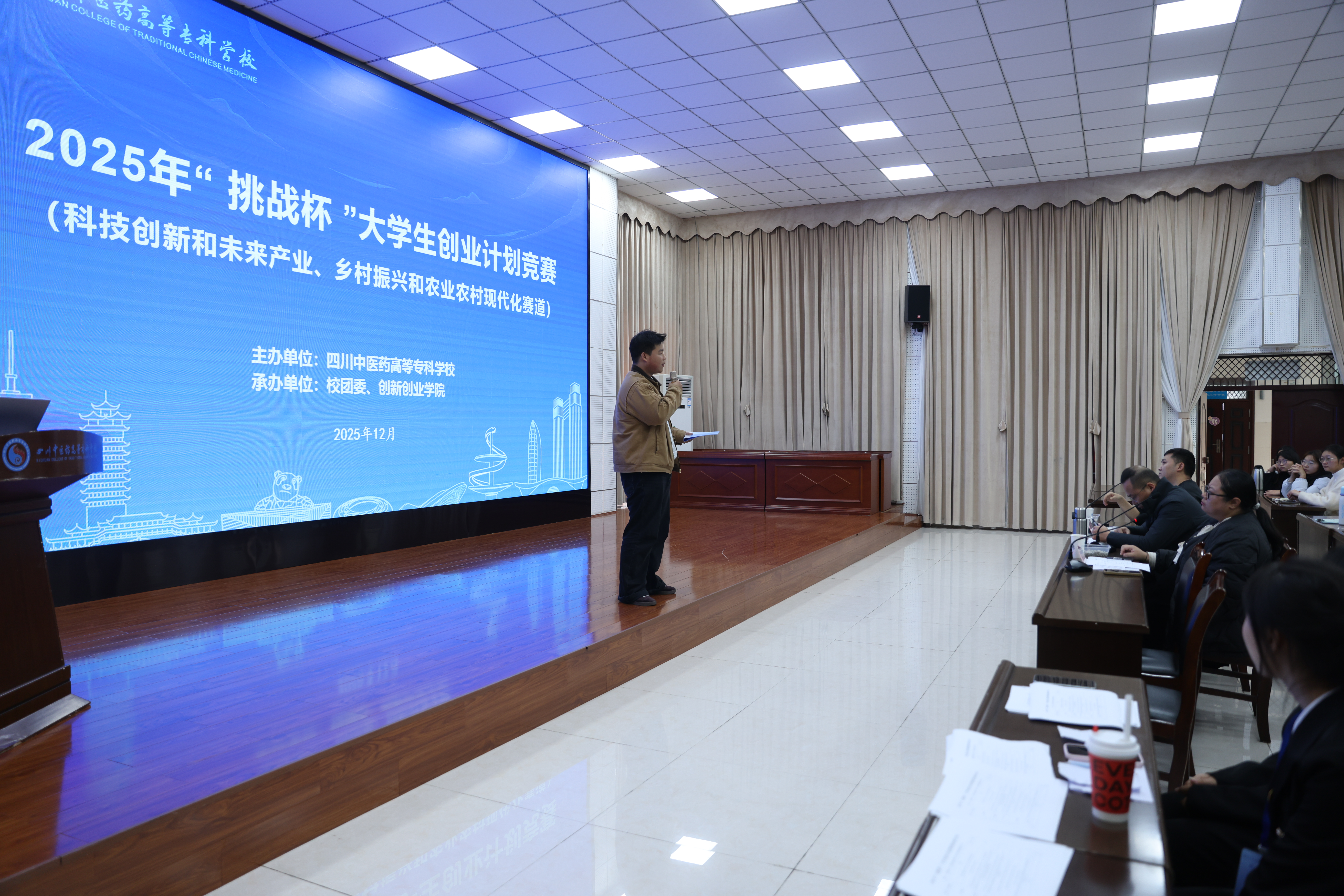 2025年12月11日,由四川中医药高等专科学校主办的2025年“挑战杯”大学生创业计划竞赛校赛决赛在我校综合楼五楼学术报告厅隆重举行。校党委副书记商碧辉、校团委、科技处、教务处、各二级学院负责人以及参赛师生代表齐聚一堂,共同见证了这场创新创业盛会。